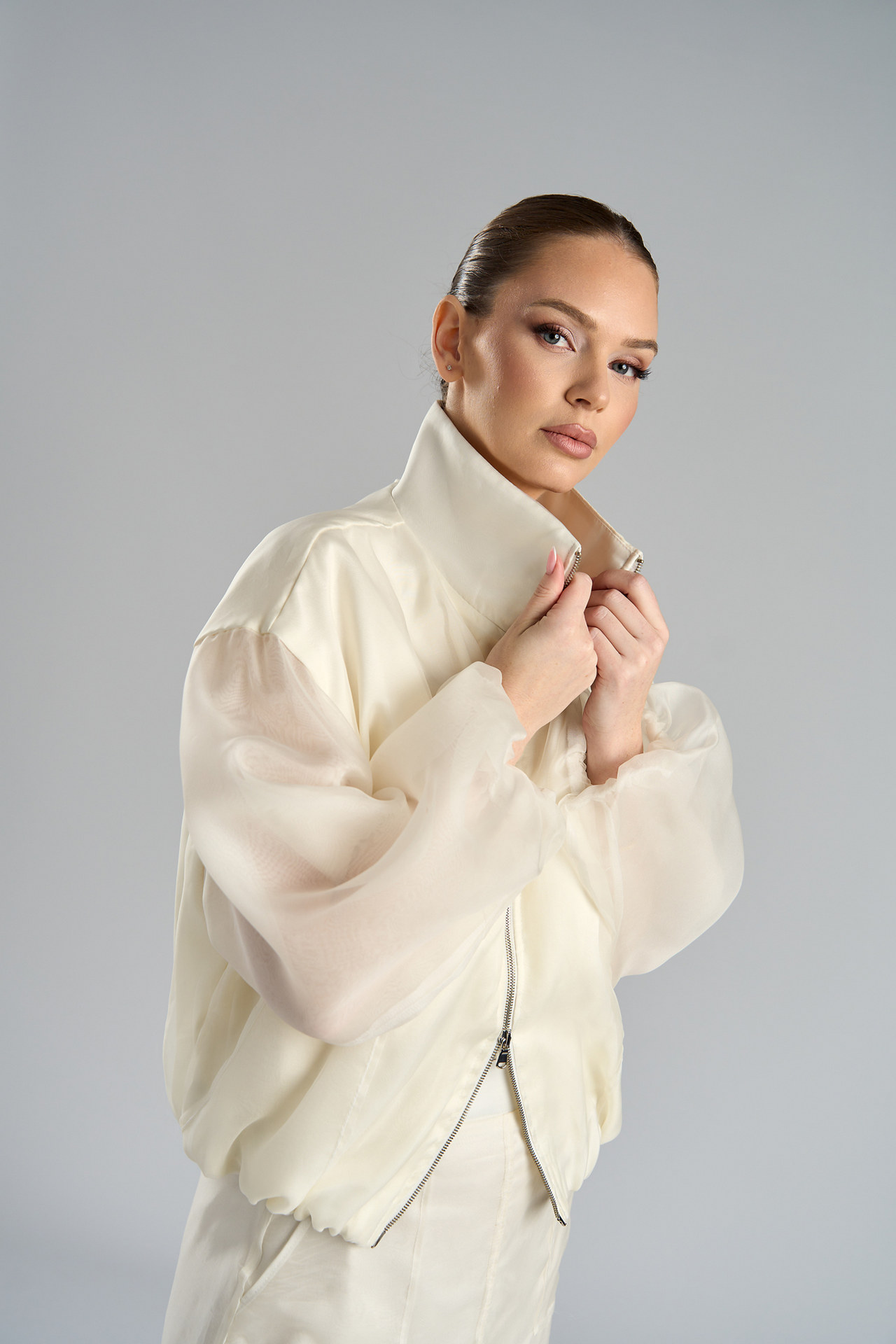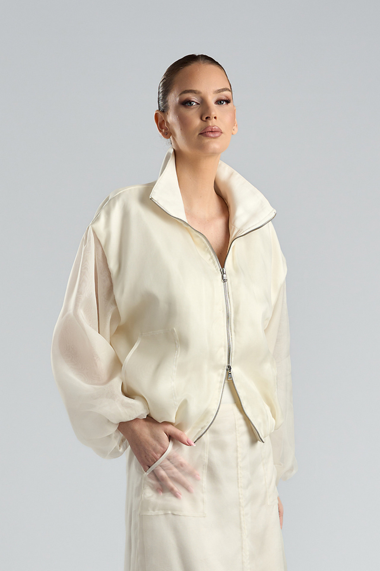 Bomberul din organza de mătase naturală redefinește eleganța modernă prin transparențe fine și detalii rafinate. Mânecile ușor transparente, realizate din două straturi de organza, adaugă volum și subtilitate, în timp ce buzunarele aplicate transparente și fermoarul metalic cu dublu cursor completează designul contemporan. Elasticul din tiv și manșete oferă confort și o linie lejeră, transformând această piesă într-o alegere sofisticată pentru ținute statement.