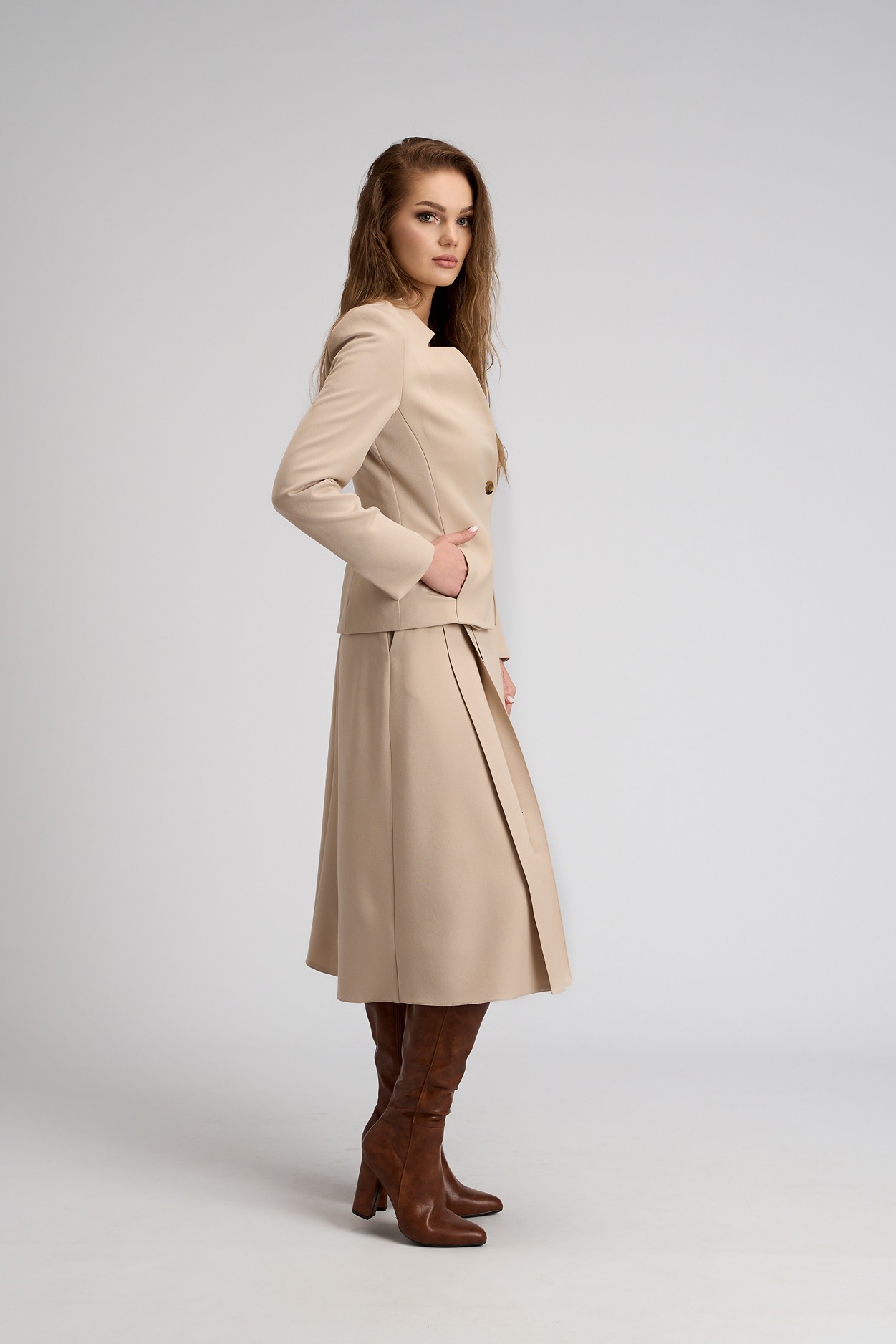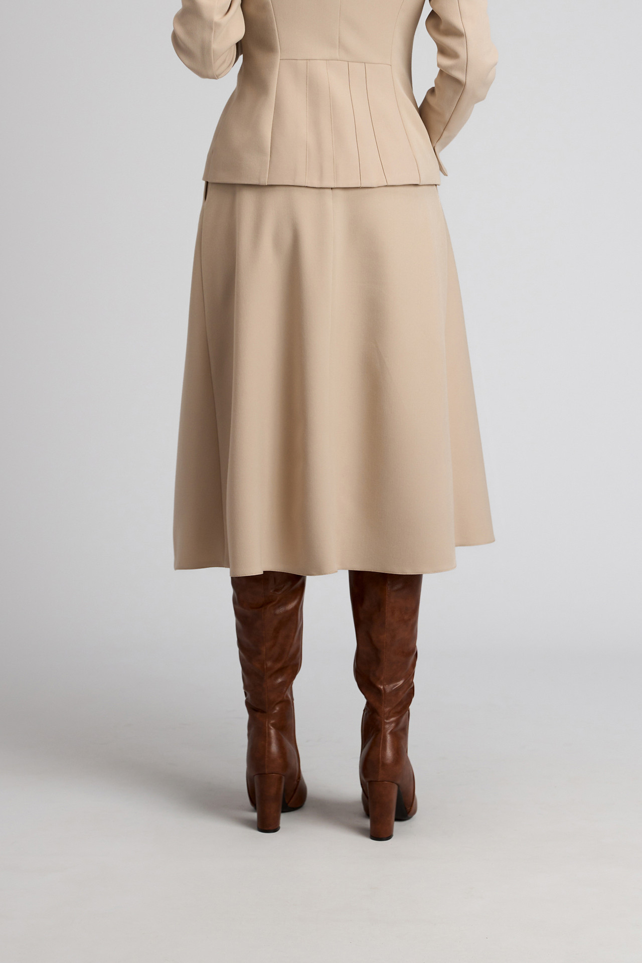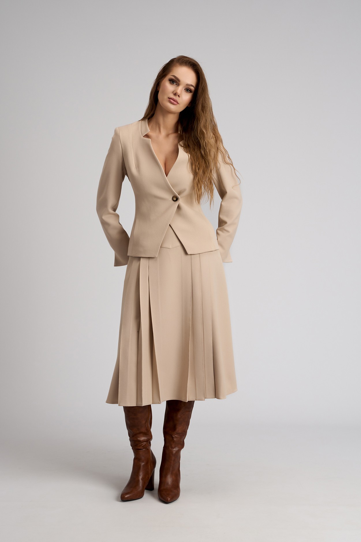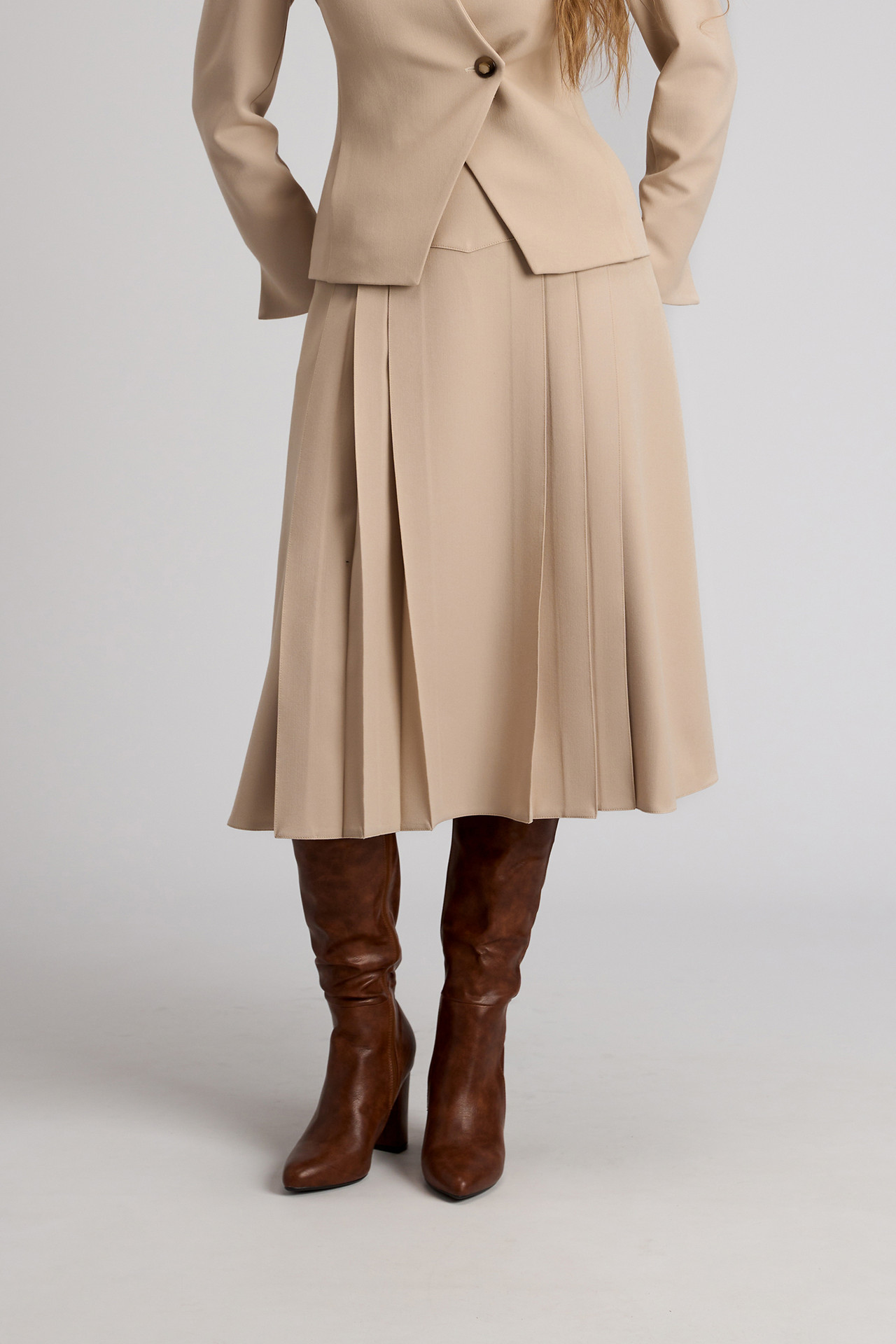 Fusta de lungime midi cu betelie fata in forma de V este prevăzută cu câte 3 pliuri elegante pe fiecare parte laterală ,buzunare in cusatura laterala pentru un plus de functionalitate,inchidere spate cu fermoar invizibil,captusita cu o tesatura satinata si placuta la atingere.