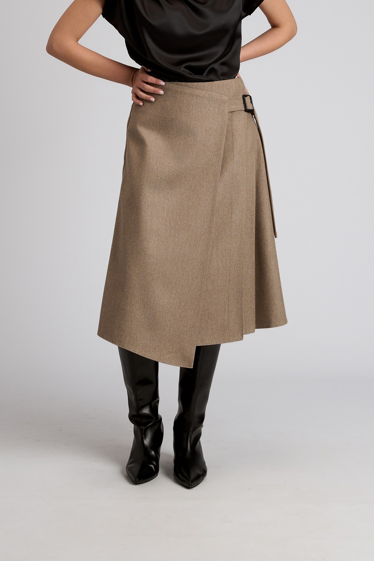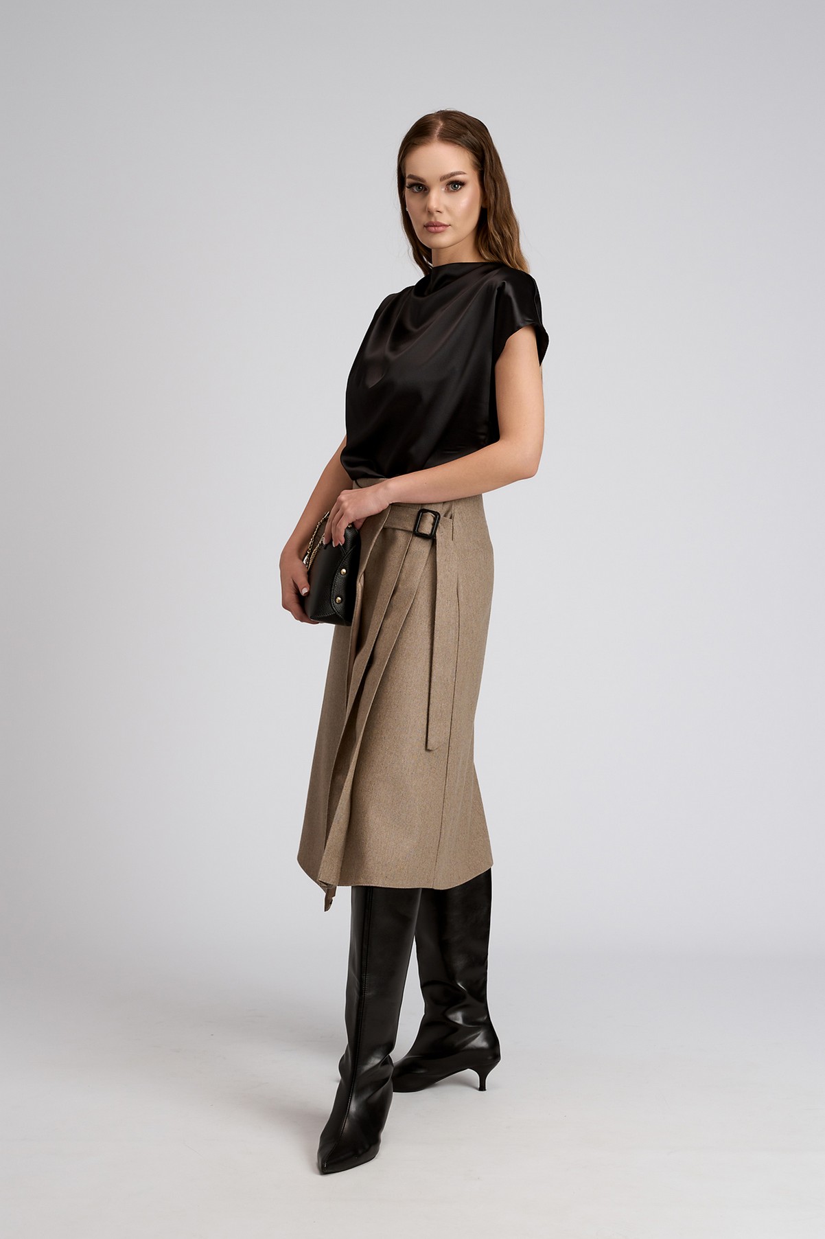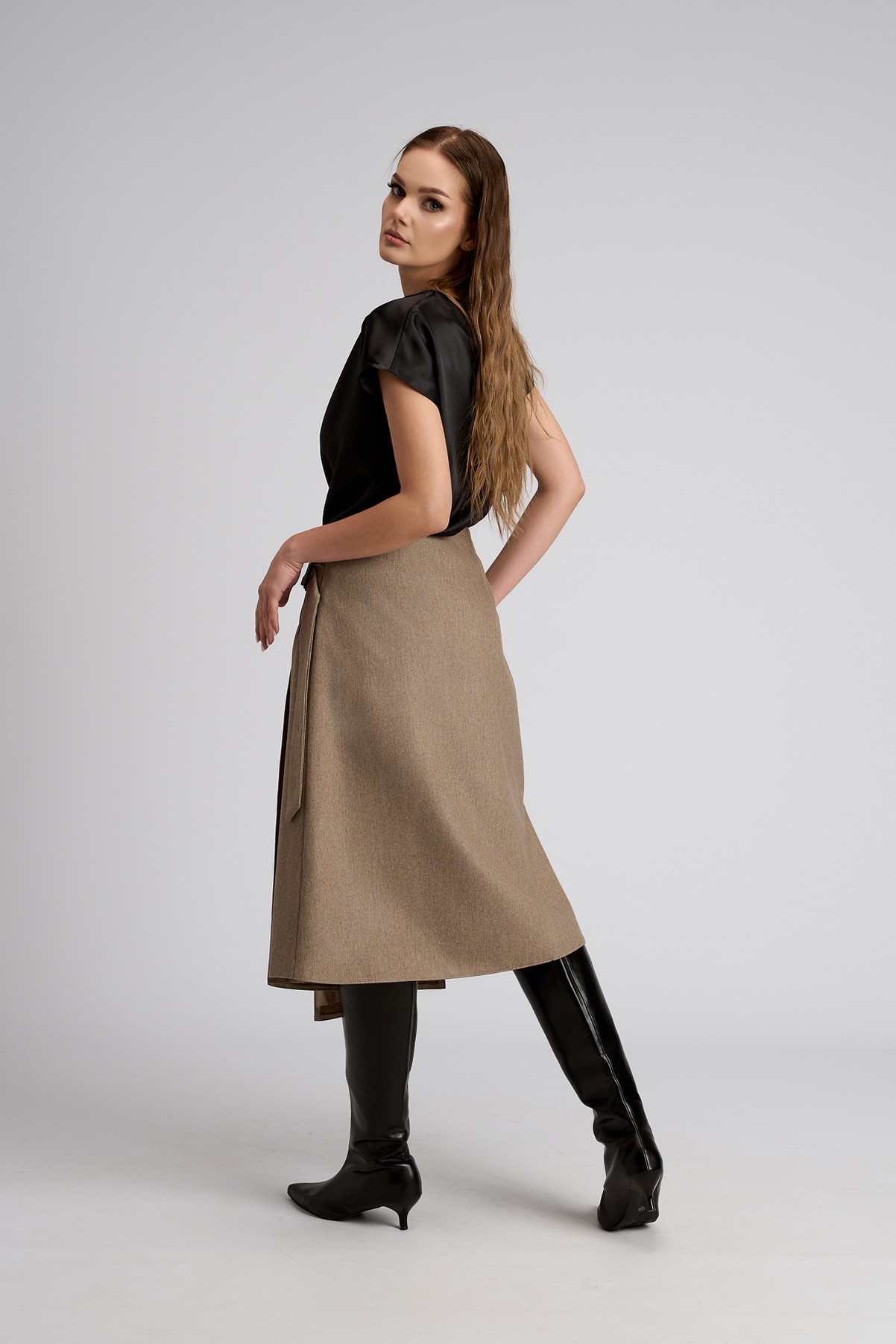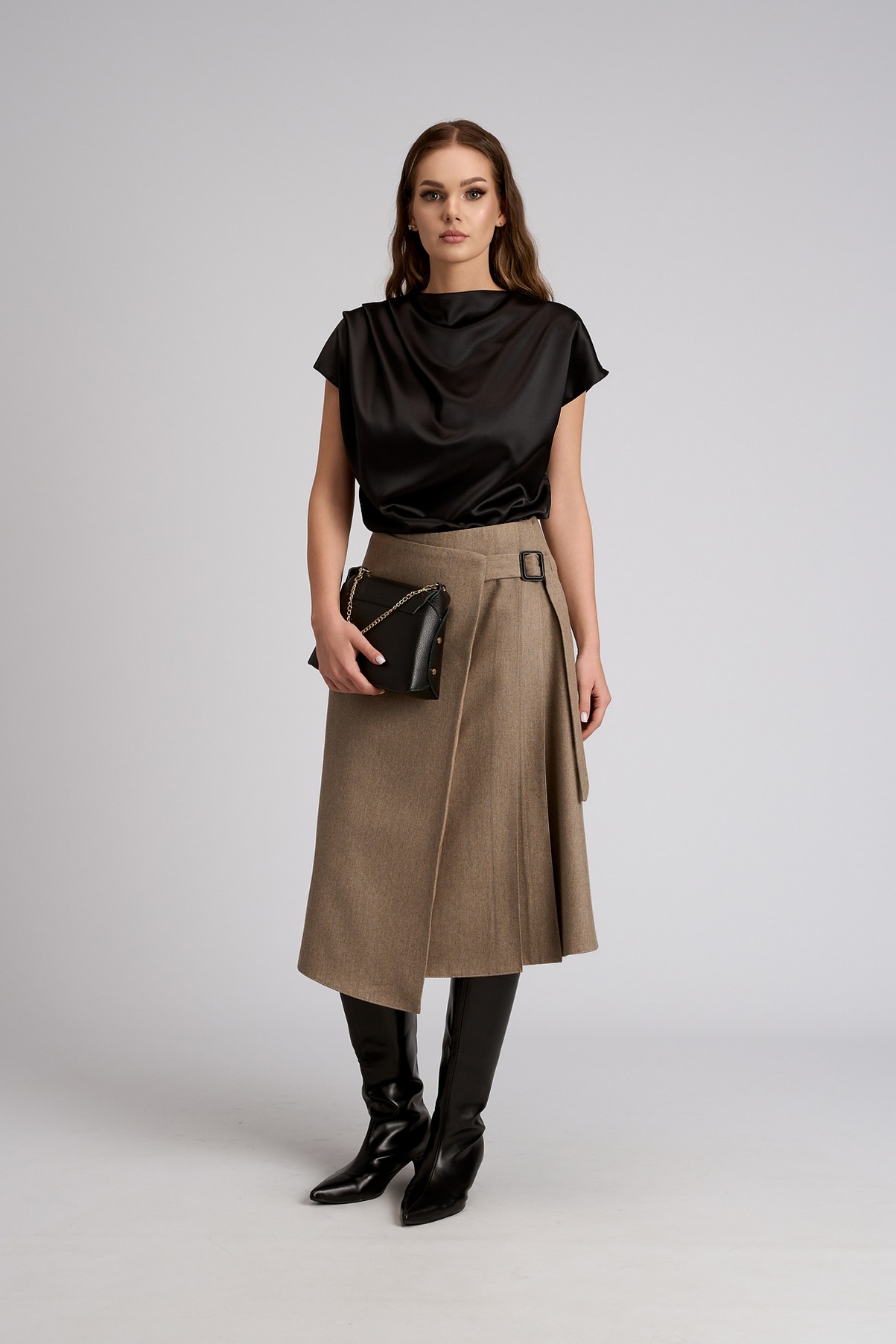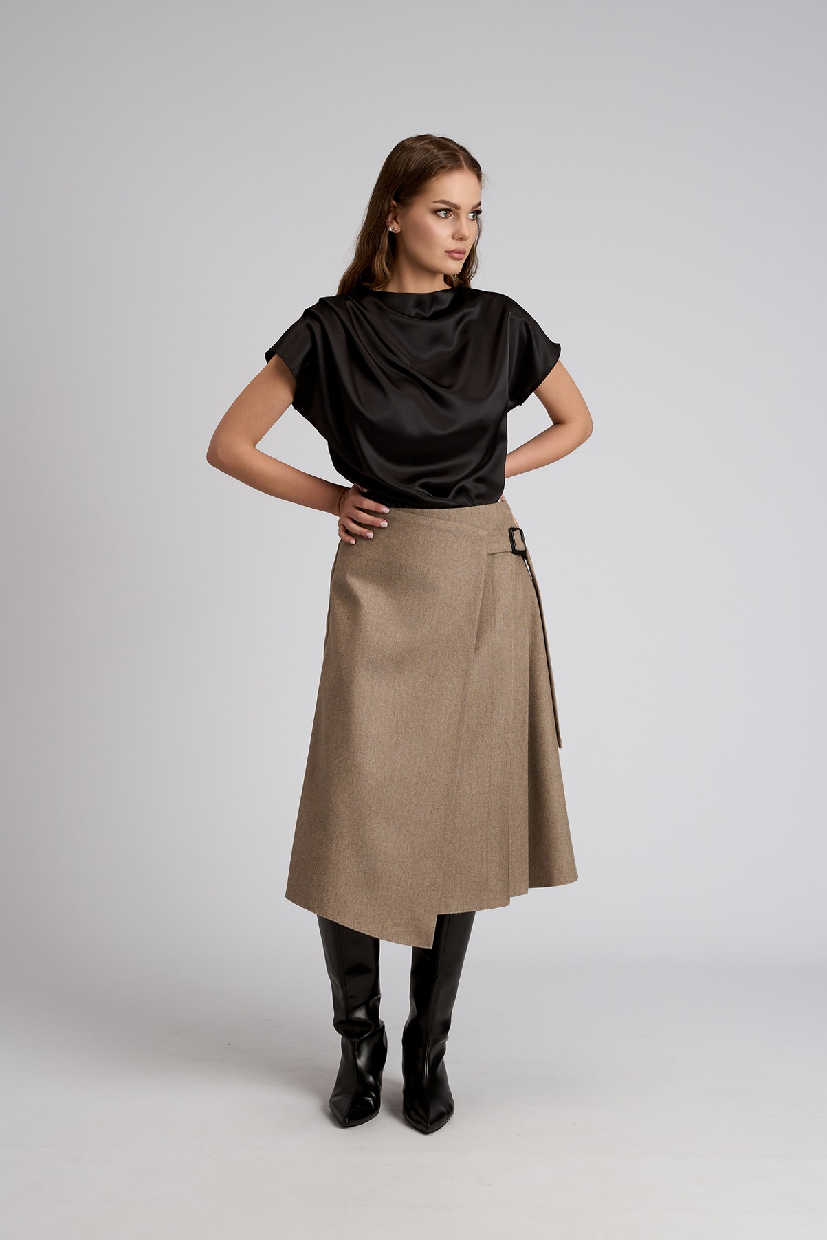 Fustă midi din lână, cu design petrecut și croială asimetrică.Faldurile laterale adaugă mișcare și volum, iar cordonul cu cataramă accentuează elegant talia. Realizată din lână moale, această fustă oferă confort termic și un aspect sofisticat — perfectă pentru ținute de birou sau casual-chic în sezonul rece.