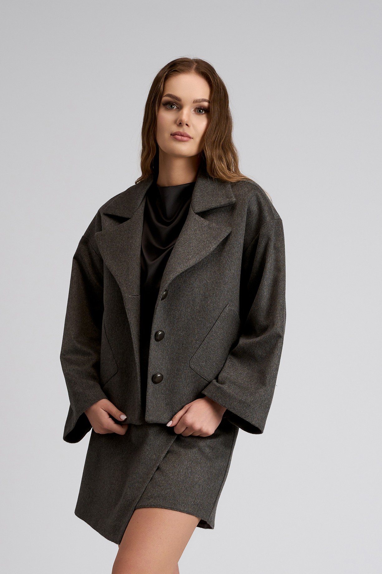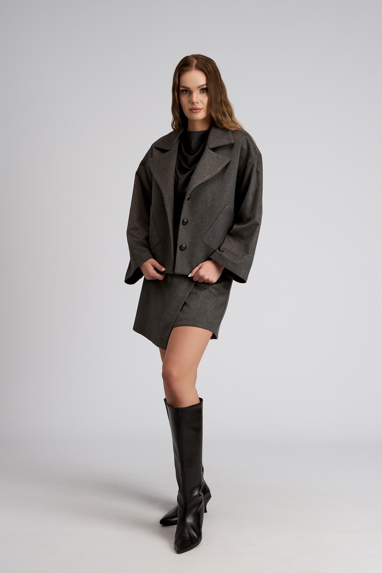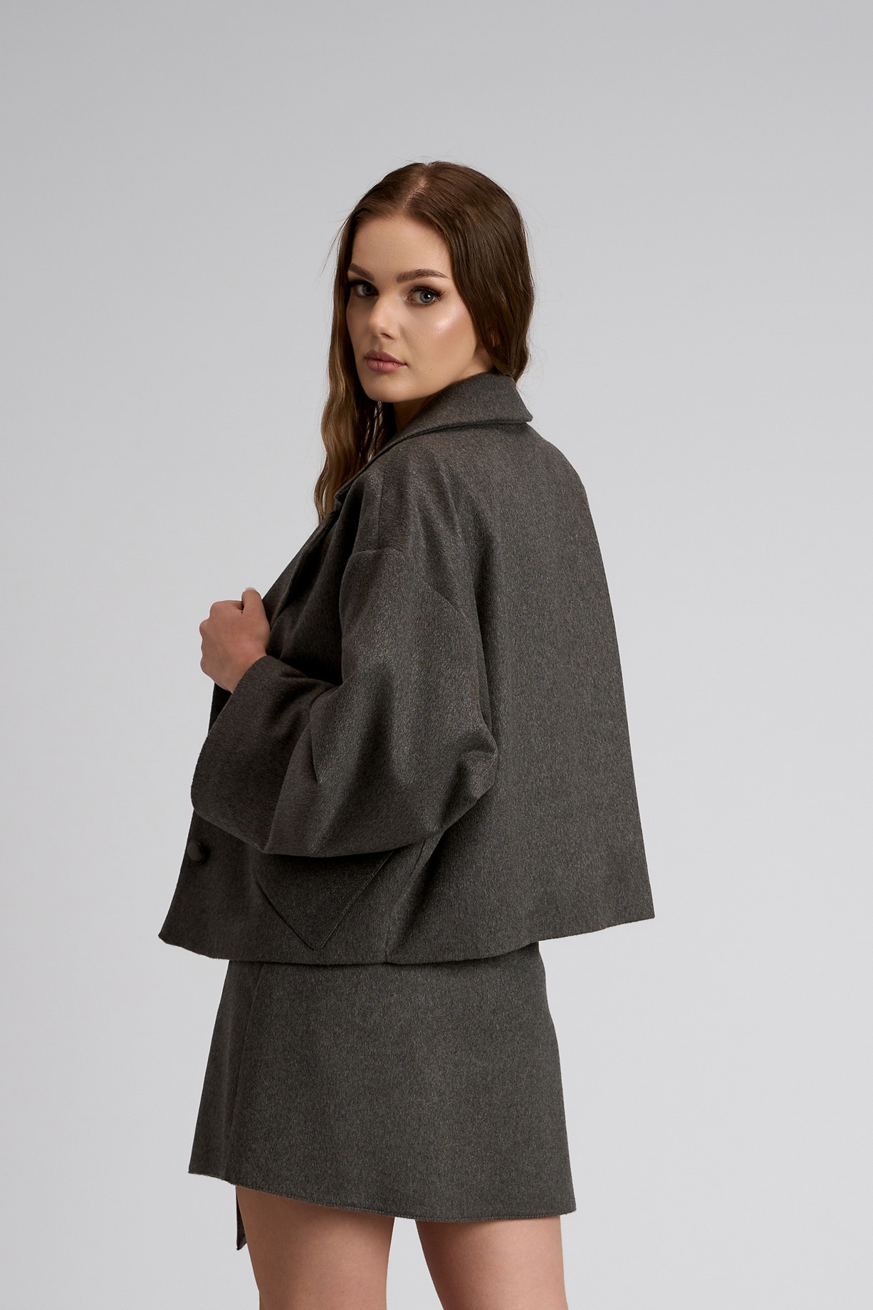 Jachetă scurtă gri din lână cu buzunare aplicate, guler cu rever și închidere frontală cu 3 nasturi. Croiala scurtă și materialul călduros o fac ideală pentru ținute casual sau office  în sezonul rece.