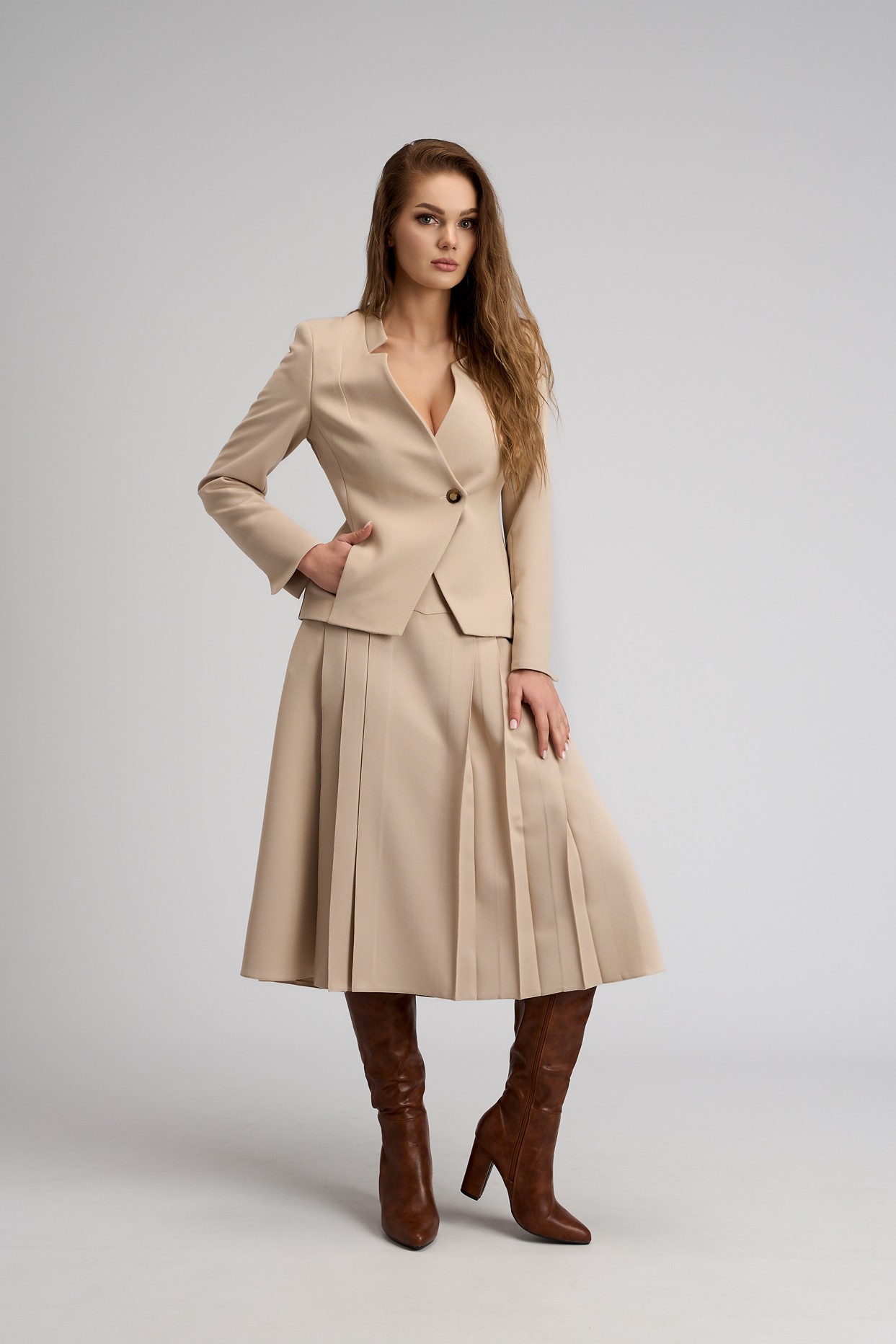 Sacou bej elegant, confecționat dintr-o stofă fină, ideal pentru ținute office sau evenimente speciale. Are o croială cambrată care accentuează silueta, închidere petrecută cu un nasture decorativ, guler cu detaliu în V și buzunare in cusatura laterala. Este captusit cu o tesatura satinata.