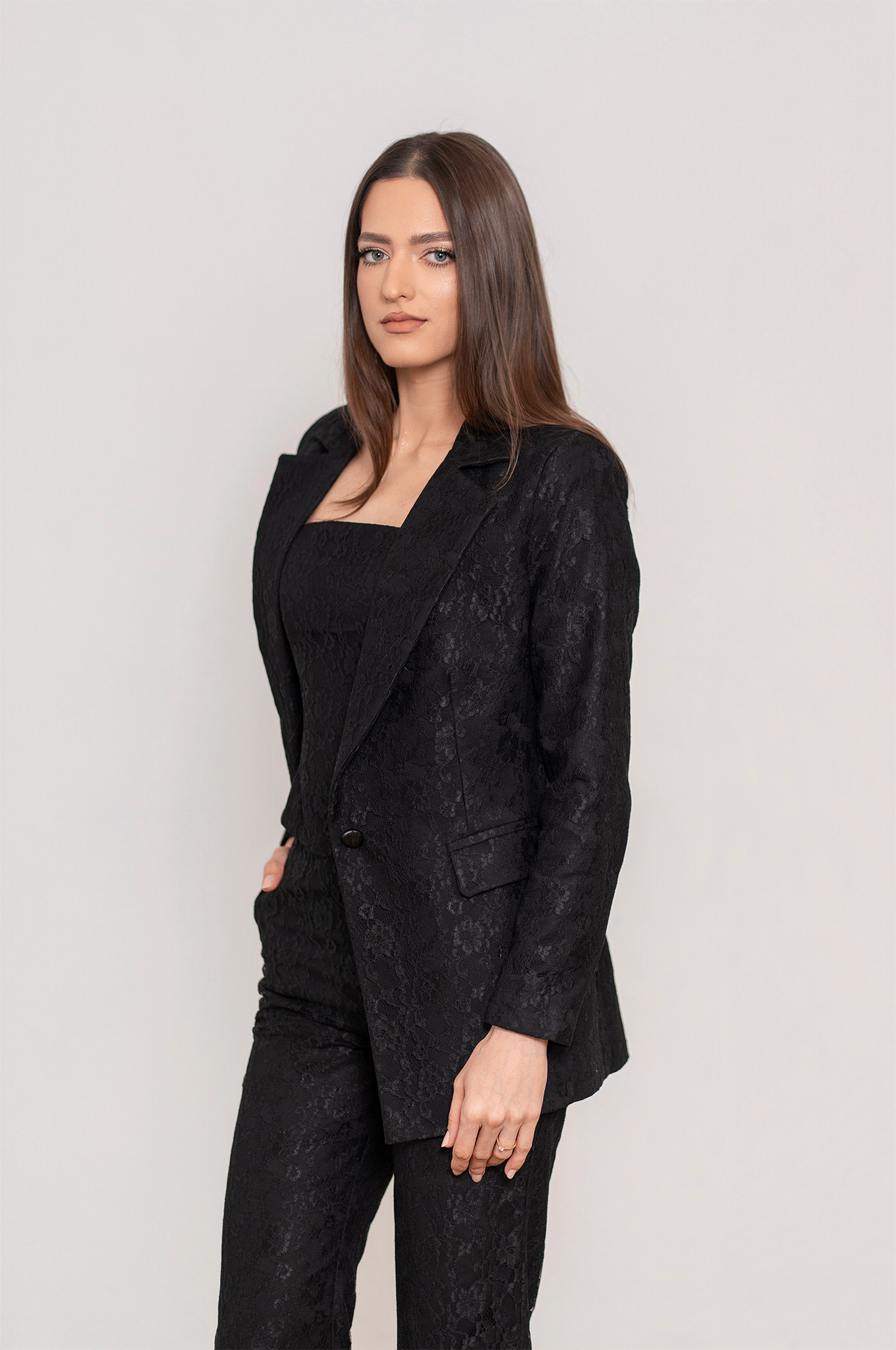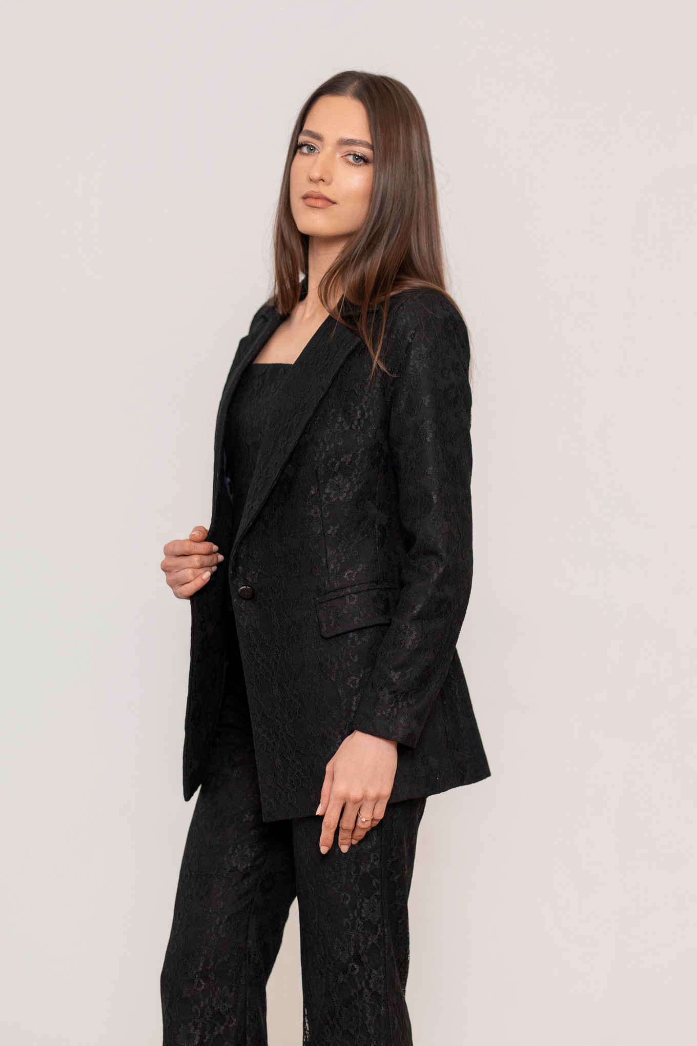 Acest sacou din dantelă pentru damă îmbină eleganța texturii fine cu confortul unei căptușeli din bumbac. Croiala sa modernă și detaliile rafinate îl fac ideal pentru ținute office, smart-casual sau evenimente speciale. Versatil și stilat, completează perfect orice garderobă feminină. Se asorteaza cu pantalonii și/sau corsetul din același material.