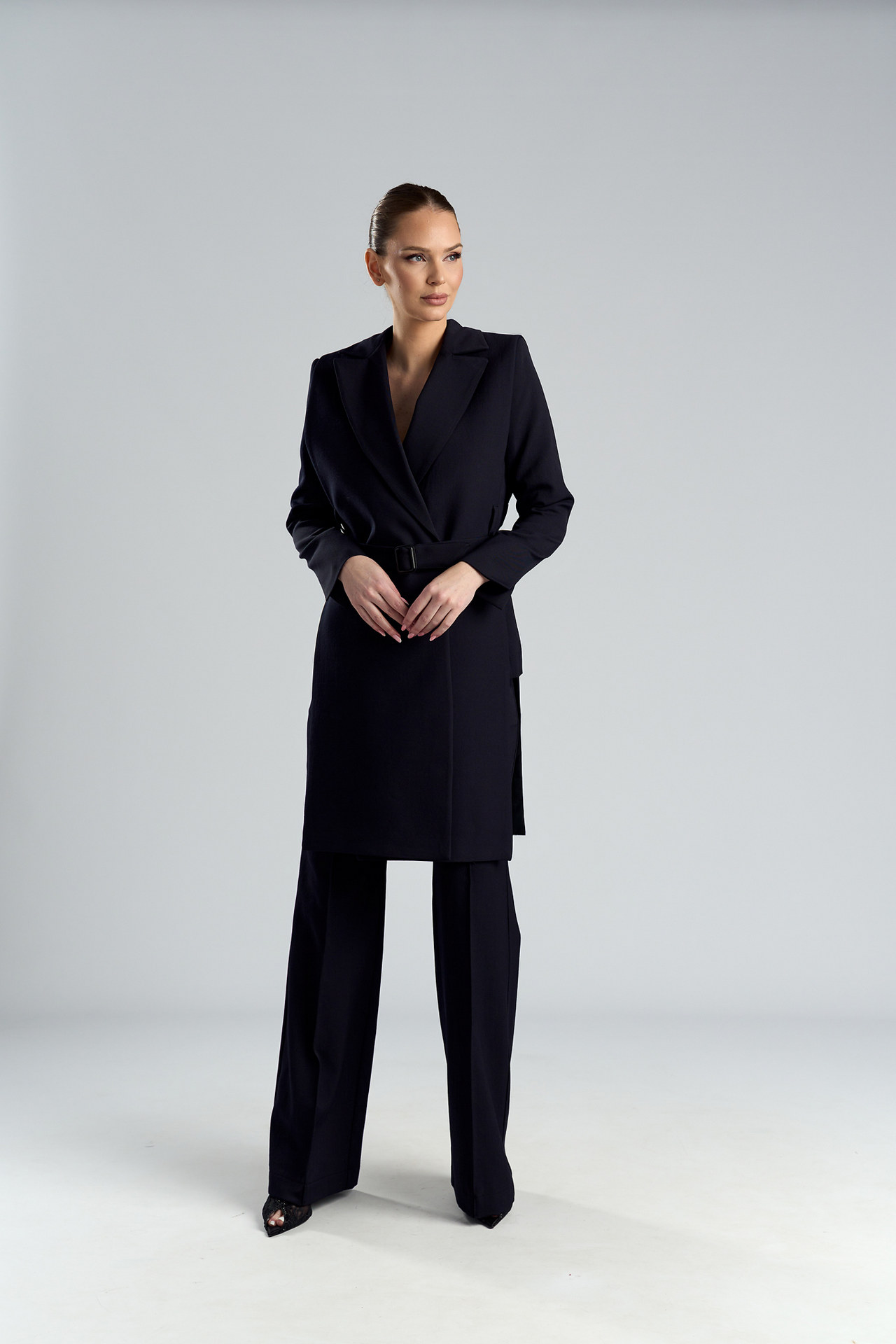 Vestă midi din stofă cu lână, tip platcă (fără cusături laterale între față și spate), cu rever și cordon cu cataramă. Designul alungește silueta și permite ajustare în talie, potrivită pentru ținute elegante sau smart-casual. Se poate purta peste un top,un sacou sau o camașă.
