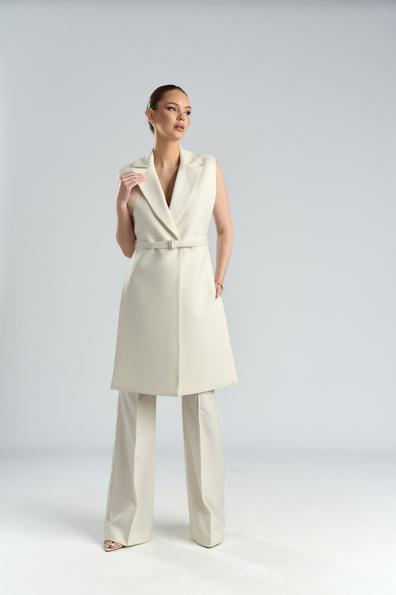 Vestă midi din stofă cu lână, tip platcă (fără cusături laterale între față și spate), cu rever și cordon cu cataramă. Designul alungește silueta și permite ajustare în talie, potrivită pentru ținute elegante sau smart-casual. Se poate purta peste un top,un sacou sau o camașă.