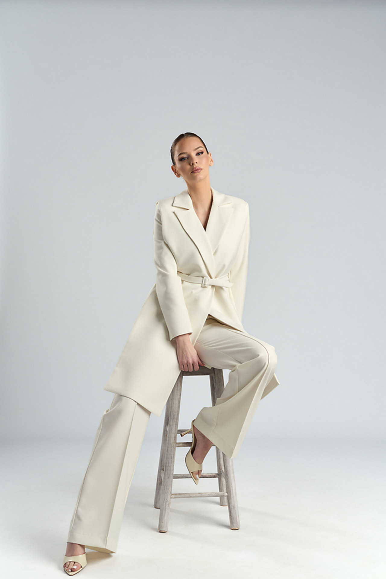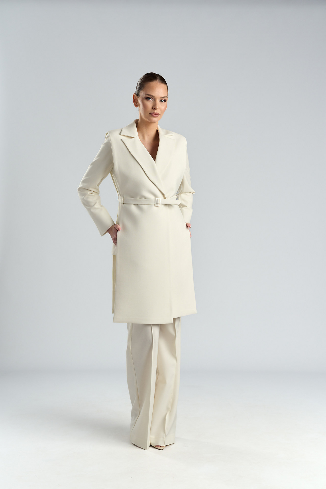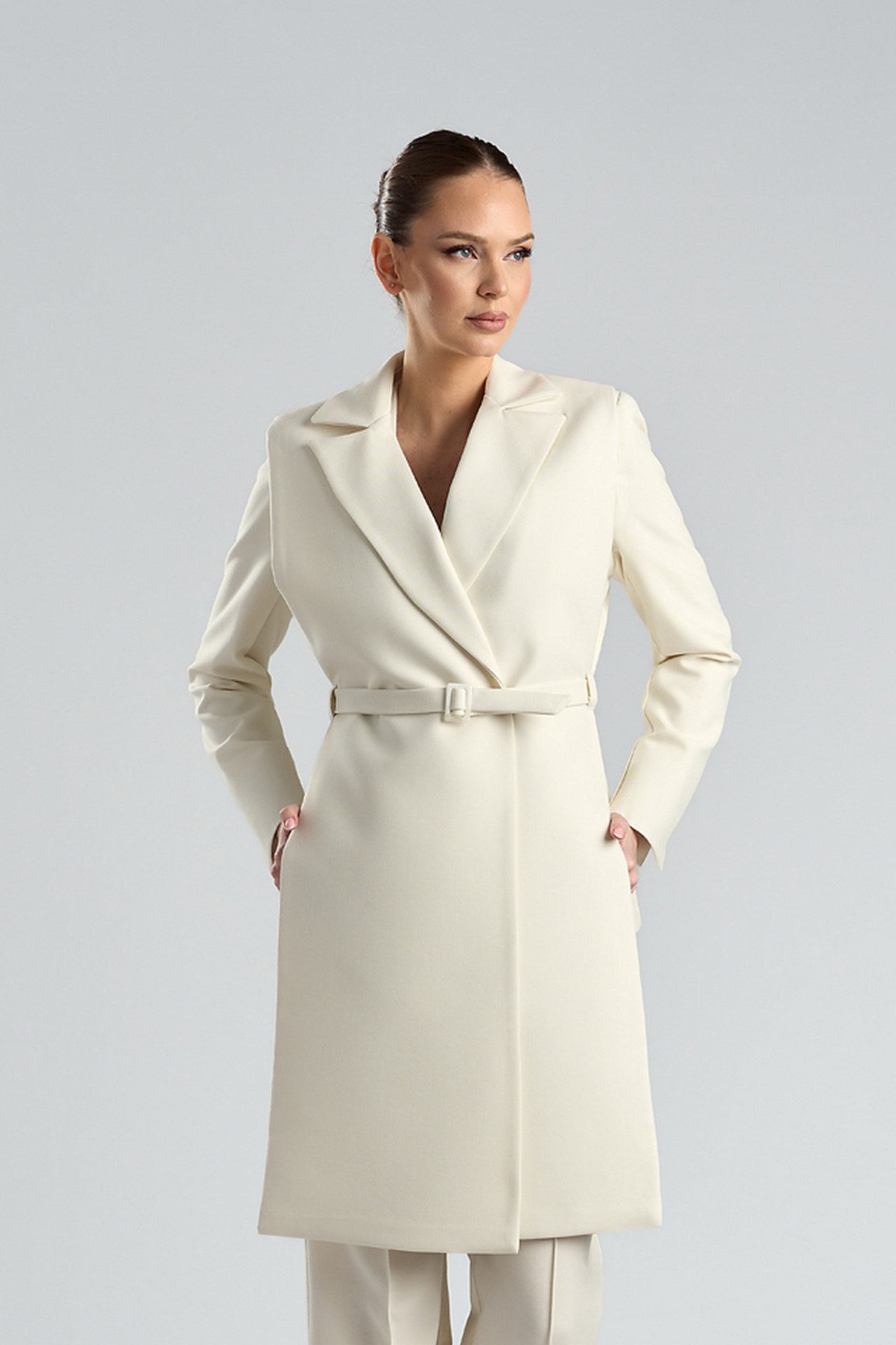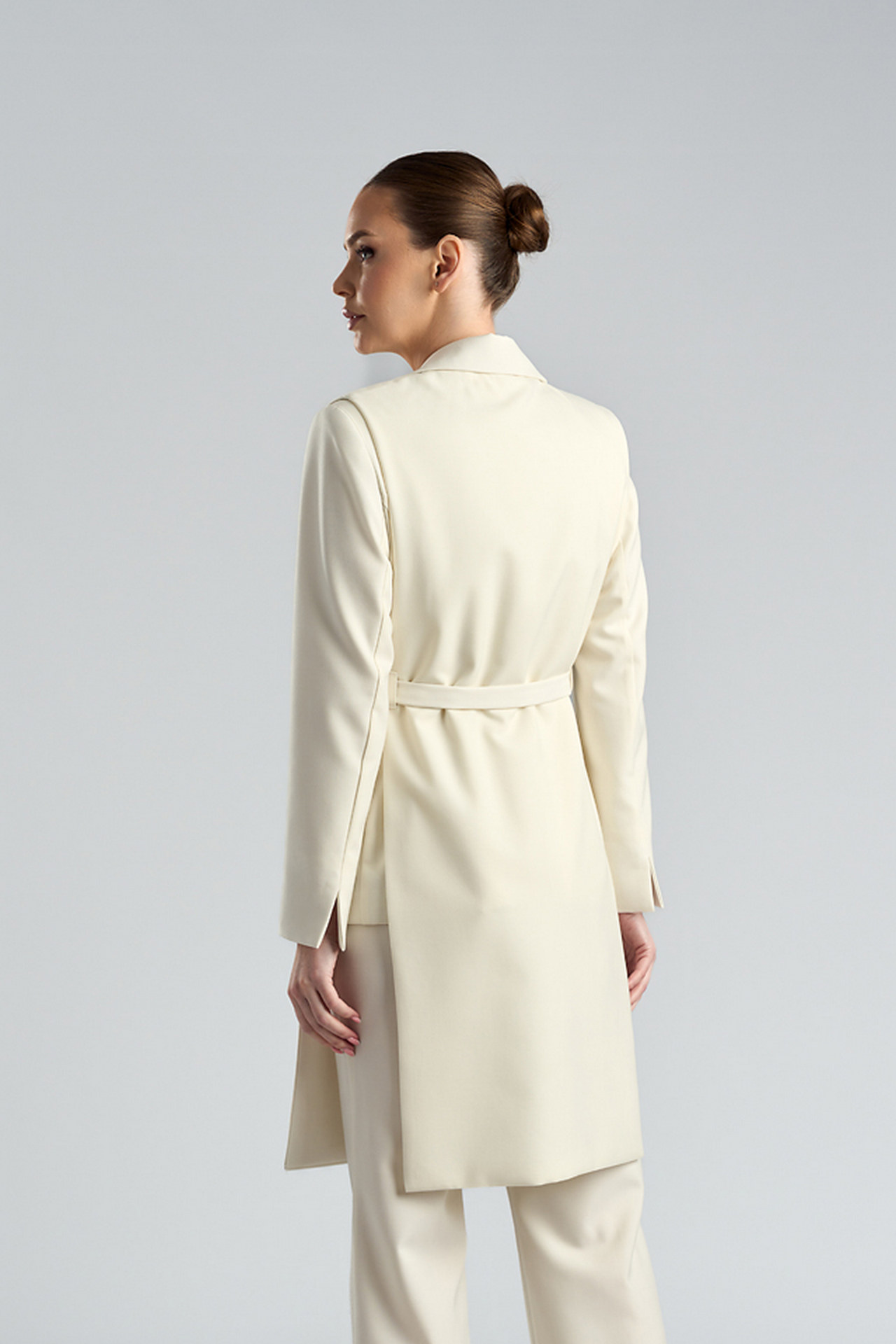 Vestă lungă ivoire tip platcă din stofă cu lână, cu rever și cordon cu cataramă Hara